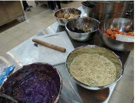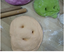时间来到下午四点,我们亲爱的陈秀兰老师用她灵巧的双手手开始教我们和面,面粉慢慢地喝足彩色的浆汁,有人往前推,有人往下推,有人手掌用力,有人手指用力,或是看不过眼接手的,或是好奇想尝试一下,总之面团在好多人的轮番“蹂躏”下慢慢变硬了,一大个饱满的面团子很是可爱,让人舍不得动手再揉开它,也还是会有人在大家不注意的时候偷偷给它捏上了表情,至于擀面皮嘛,东推推西推推,大概有个圆的样子,大家已经开心得手舞足蹈了。