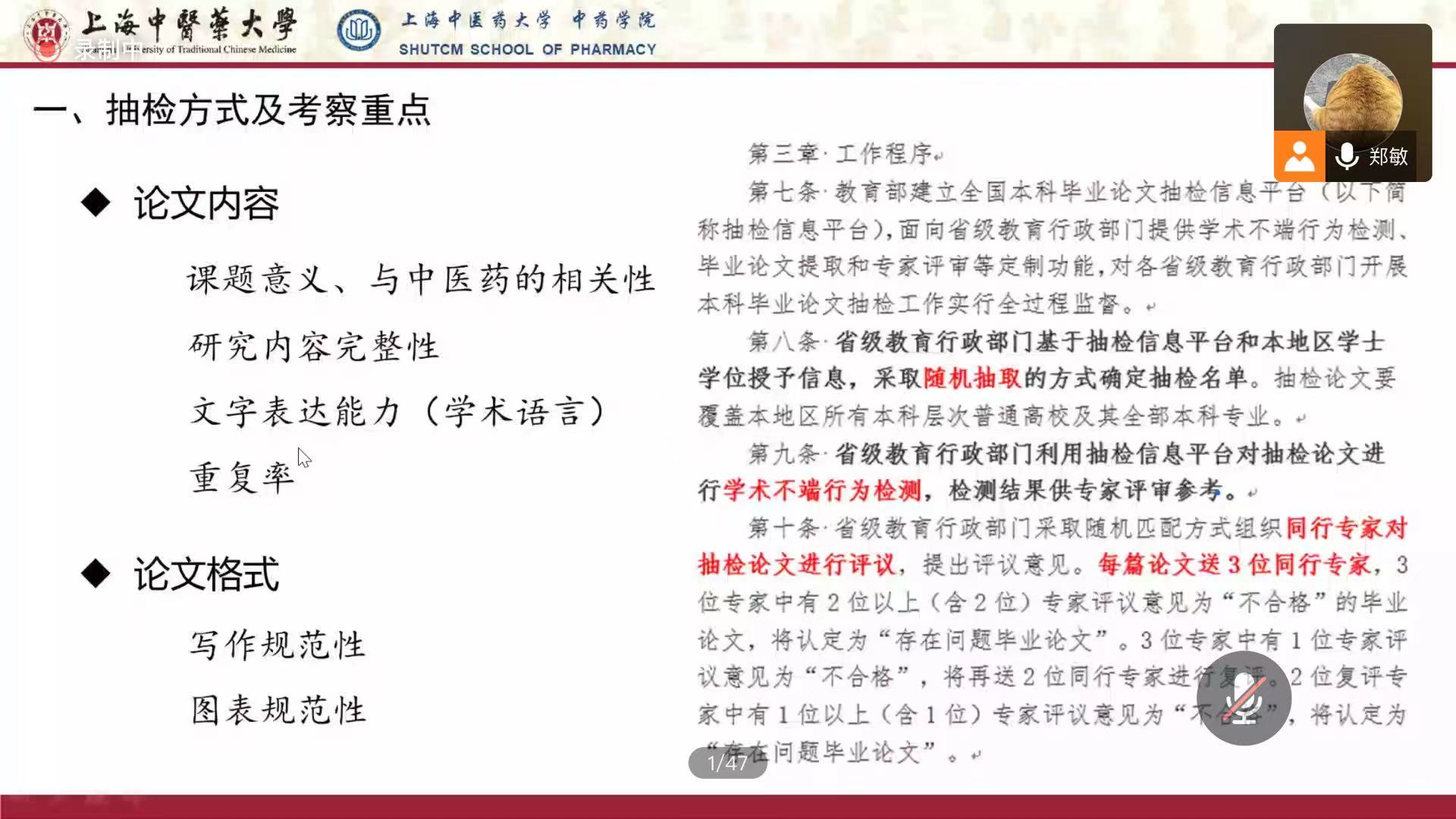 为贯彻落实教育部关于《本科毕业论文(设计)抽检办法》的精神,保证本科人才培养质量,严把出口关,韩国h漫 于2021年4月9日晚上通过腾讯会议在线上召开了2021届中药学专业本科生学术规范宣讲会。