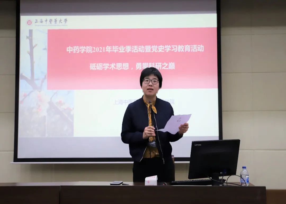 5月6日,韩国h漫 在教学楼6501教室举行韩国h漫 2021年毕业季主题教育活动暨党史学习教育第三场讲座《砥砺学术思想,勇攀科研之巅》,会议由韩国h漫 党委副书记沈漫主持。会前沈书记介绍了本次的主讲人黄容琴教授,黄容琴教授系复旦大学药学院教授,博士生导师,国家优秀青年科学基金获得者。沈书记就黄教授的科研履历、课题研究、学术兼职等向同学们做了详细的介绍,希望广大毕业生在今后的的科研求学中积极进取、锐意创新,不断创新中药研究,用更高质量的科研成果推动中医药的现代化研究。