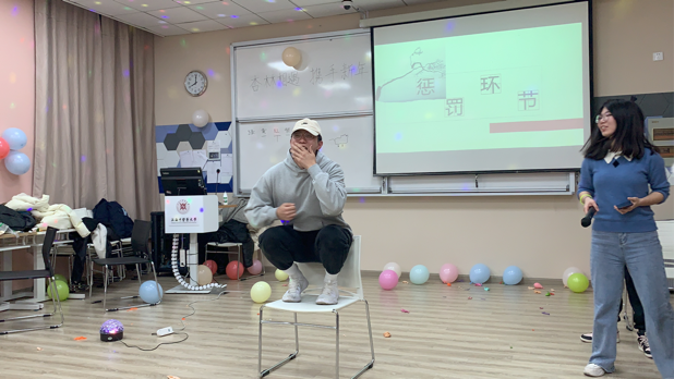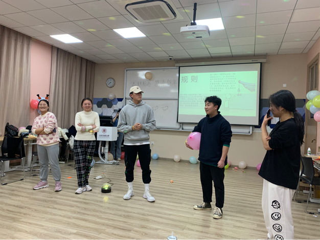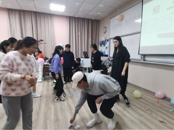 随后,欢快紧张的团体游戏——《抱团取暖》拉开了晚会的帷幕,同学们随着音乐的节奏律动起来,宛如一连串跳动的音符,当音乐声戛然而止,主持人喊出一个数字3时,同学们纷纷就近寻找伙伴抱在一起,有的甚至通过“抢夺”的方式组队,大家在欢声笑语中迅速打成一片。