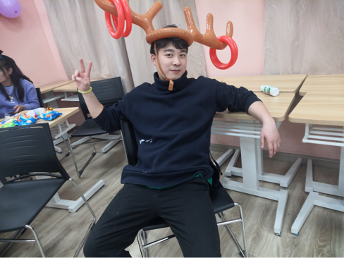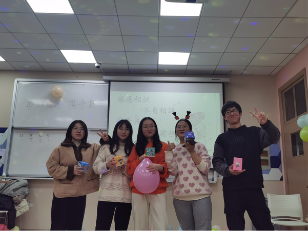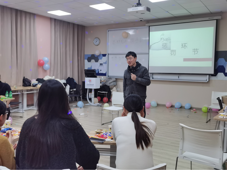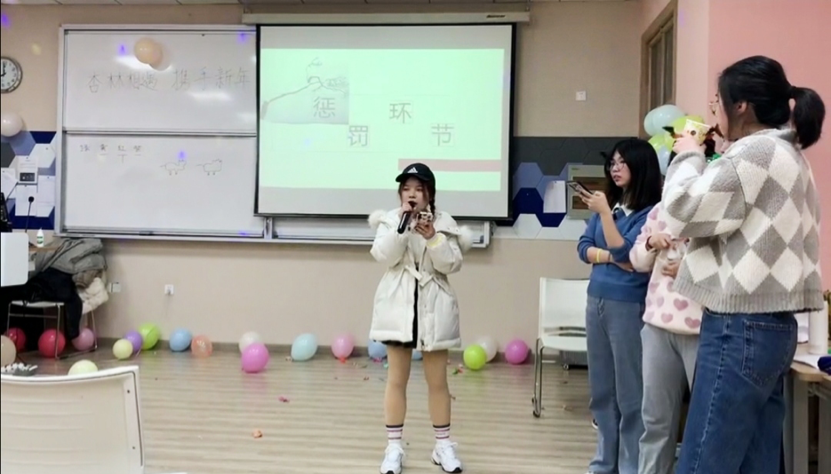 这时,王盼老师也加入到大家庭中,参与了《击鼓传花》游戏,首先由主持人介绍规则并将手里的“花”随机抛给了后面的同学,第二位同学流利对接,“花”一瞬间成了烫手山芋。巧合的是,“花”最后停留在了王盼老师手里,抽取了“用脸吃奥利奥”的小小“惩罚”,同学们纷纷拿出手机记录这个难得的画面,虽然只有二十几个人,但每个人在此时此刻都感受到了家庭的欢乐和温暖。然后,王盼老师向同学们分享了自己的趣事,并表达了新年祝福,同时还强调了安全问题,提醒大家在玩的过程中也要牢记安全注意事项。