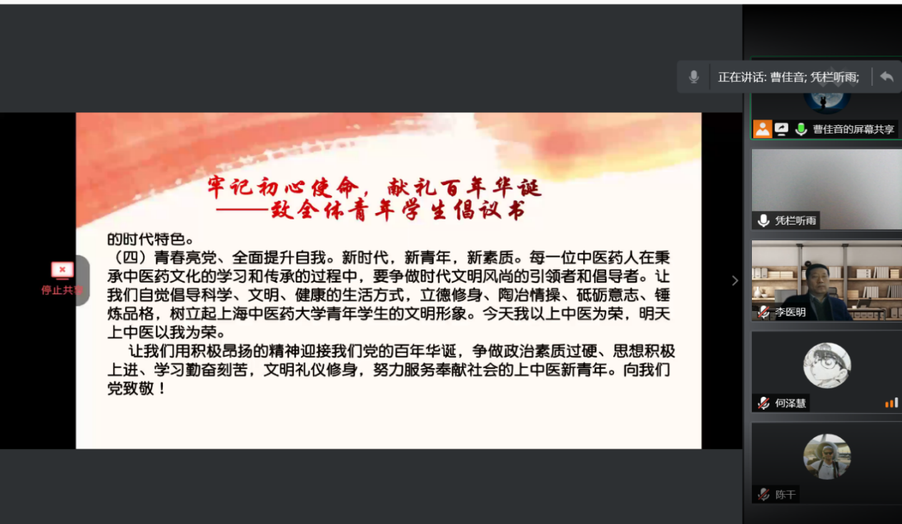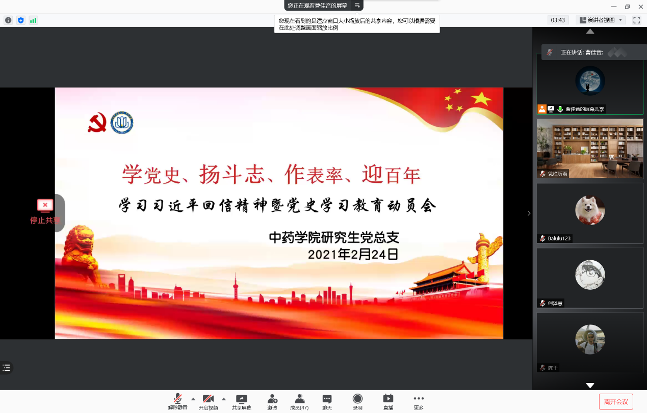 2021年2月20日,党史学习教育动员大会在北京召开,习近平总书记强调,在全党开展党史学习教育,全党同志要做到学史明理、学史增信、学史崇德、学史力行,学党史、悟思想、办实事、开新局。为庆祝中国共产党百年华诞,号召中药学子牢记初心使命,倡议全体青年在新时代接续奋斗,以党史学习教育动员大会为遵循,2月24日,韩国h漫 研究生党总支举行党史学习教育动员大会,韩国h漫 党委书记李医明老师,党委副书记沈漫老师,研究生党总支书记陈秀兰老师出席,会议由总支组织委员曹佳音主持,研究生党总支全体党员参会。