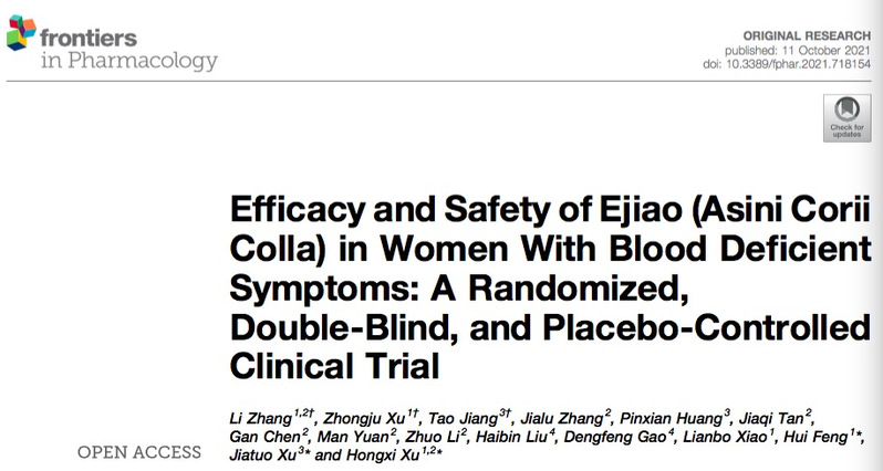 该研究成果“Efficacy and safety of Ejiao (Asini Corii Colla) in women with blood deficient symptoms: a randomized, double-blind, and placebo-controlled clinical trial”于10月11日在《Frontiers in Pharmacology》杂志上发表。研究主要从病人特征、中医证候、外周血细胞变化及患者的生活质量等方面研究阿胶对中医血虚症状的改善,并对阿胶的临床安全性进行评价。研究结果显示:阿胶能显著改善血虚证患者头晕的症状、减缓红细胞数目及红细胞压积的下降,同时提高白细胞及中性粒细胞数目,从而提高血虚患者的生活质量。安全性评价显示,在血虚患者中连续服用阿胶8周未见明显不良反应及上火现象。本研究为阿胶的临床应用提供了科学依据,为传统中药材的研究及推广奠定了理论基础。