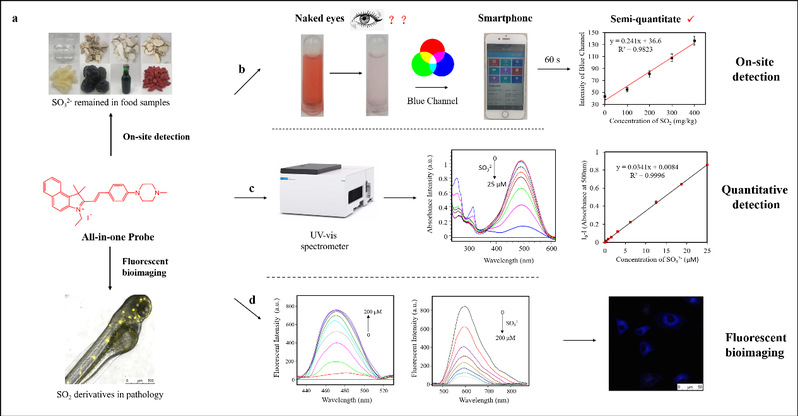 该研究基于迈克尔加成反应原理,设计了一款选择性好、灵敏度高、抗干扰能力强的亚硫酸盐特异性荧光探针I,同时利用该探针的紫外吸收以及荧光强度变化与反应液中亚硫酸盐的浓度的线性相关性,可实现溶液中亚硫酸盐的定量分析,从而建立了中药和食品中二氧化硫残留的定量测定方法,检测效率和检测成本明显优于现有法定方法。同时本研究还发现在探针与亚硫酸盐反应过程中,溶液颜色变化与反应液中亚硫酸盐的浓度也表现出较好的相关性,并研发了一款智能手机比色APP软件,用于建立中药材和食品二氧化硫残留的智能快速检测方法,为中药和食品的安全保障和质量控制提供了有利的检测工具。此外,由于该荧光探针生物毒性低,抗干扰能力强,灵敏度高,本研究还采用生物成像技术将其用于细胞和斑马鱼中亚硫酸盐示踪,目前正在探索该技术用于与亚硫酸盐相关疾病的诊断方法的建立。