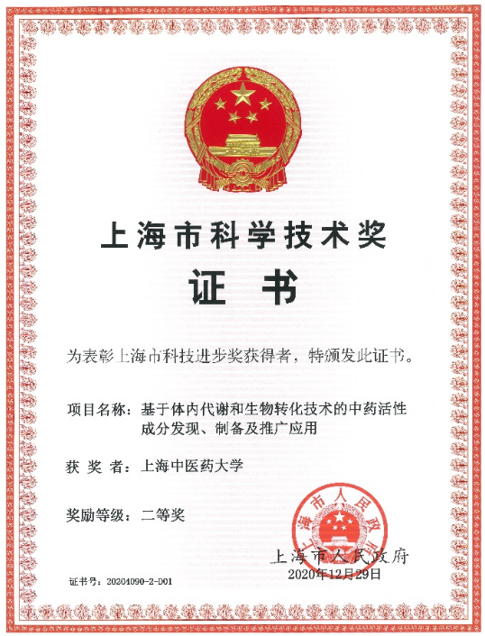 张彤教授领衔完成的“基于体内代谢和生物转化技术的中药活性成分发现、制备及推广应用”项目荣获上海市科技进步奖二等奖,本项目的完成人还有陶建生教授,教学实验中心丁越研究员、韩涵副教授等。