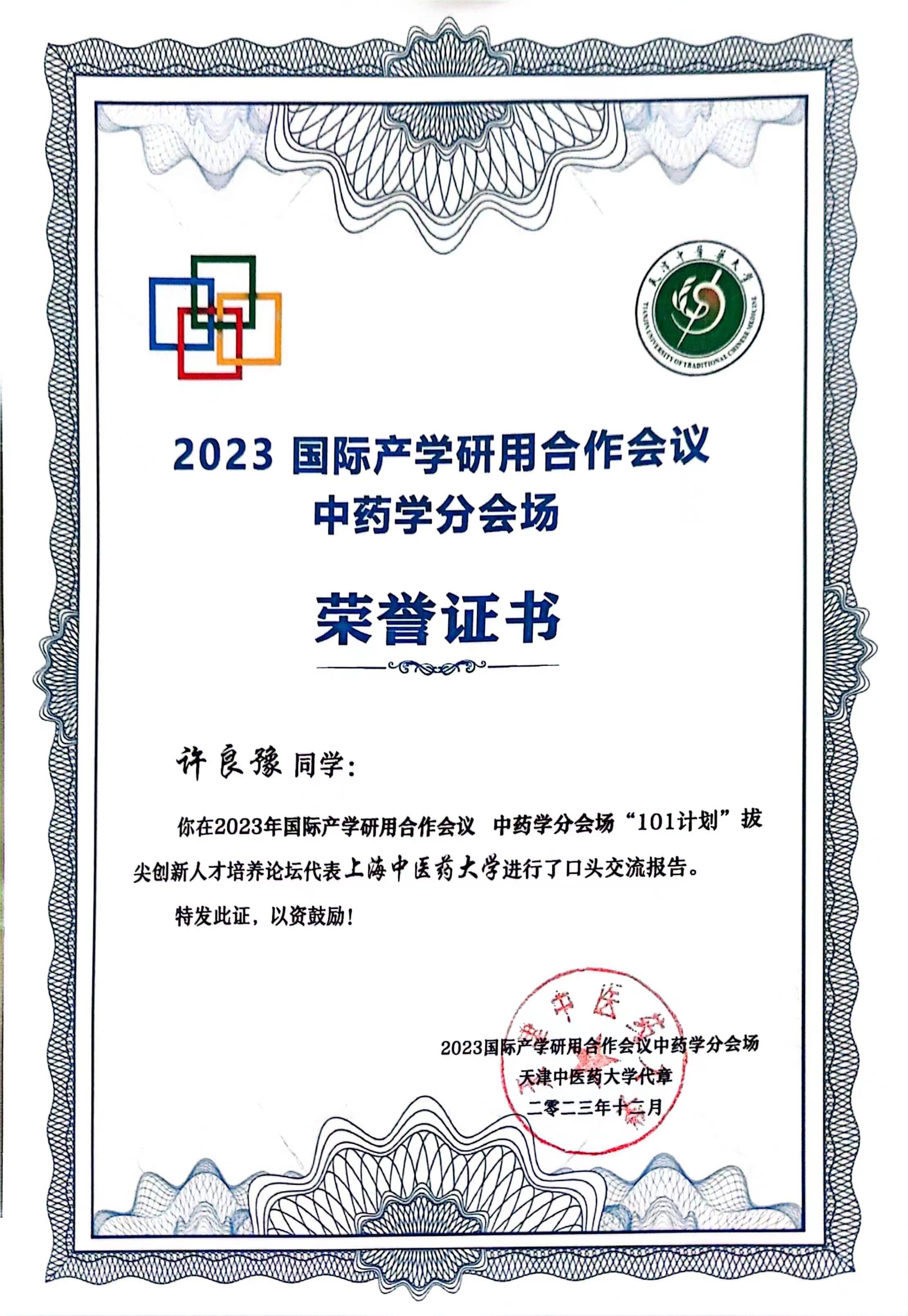 为响应教育部学校规划建设发展中心的相关工作要求,深入探讨拔尖人才培养中的关键问题,推动中医药事业的高质量发展,近日,2023国际产学研用合作会议中药学分会场在天津中医药大学举行,韩国h漫 名誉院长徐宏喜,副院长郑昌武、教务副主任郑敏与3名2023级中药学创新班同学分别参与主会场和“101计划”拔尖创新人才培养分论坛交流。
