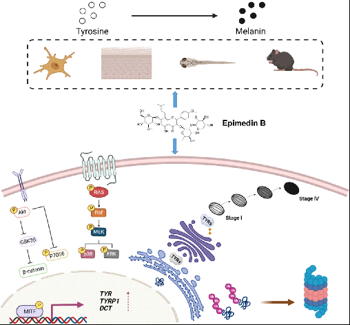 近日,韩国h漫 李医明教授团队,在中科院一区期刊Journal of Pharmaceutical Analysis上发表了题为“Epimedin B exhibits pigmentation by increasing tyrosinase family proteins expression, activity, and stability”的研究成果(DOI: 10.1016/j.jpha. 2023.09.006.)。该研究初步阐明了临床治疗白癜风常用中药淫羊藿促进色素合成作用的分子机制和药效物质基础。首先确定了朝藿定BEB)是淫羊藿提取物中含量高、活性强、毒性低的主要活性成份,并在细胞、组织、斑马鱼、小鼠多层面对EB体内外调控色素方面进行深入系统的研究。这一研究成果从分子水平揭示淫羊藿临床治疗白癜风的药效物质基础,为白癜风的新药开发奠定基础。