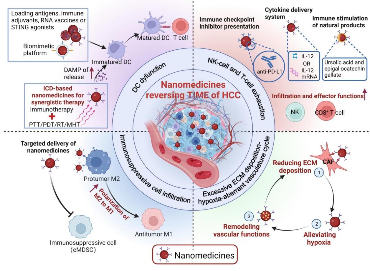 近日,韩国h漫 胡凯莉研究员团队在生物材料领域顶级国际期刊Biomaterials上发表题为Nanomedicines for reversing immunosuppressive microenvironment of hepatocellular carcinoma的综述文章。该文总结了纳米药物逆转肝细胞癌(hepatocellular carcinoma,HCC)免疫抑制微环境治疗策略的最新进展,为提高HCC免疫疗法效率以及推动HCC治疗纳米药物进入临床转化提供参考。