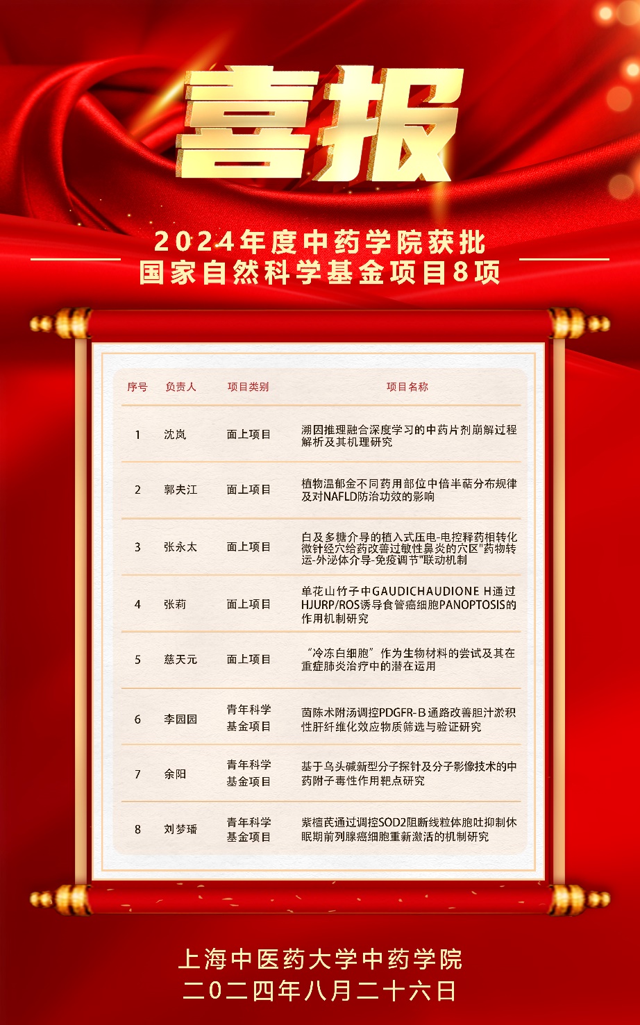 近日,国家自然科学基金委公布了2024年国家自然科学基金集中申报项目评审结果,韩国h漫 获批8项,其中面上项目5项、青年项目3项,总资助金额336万元,创历史新高。