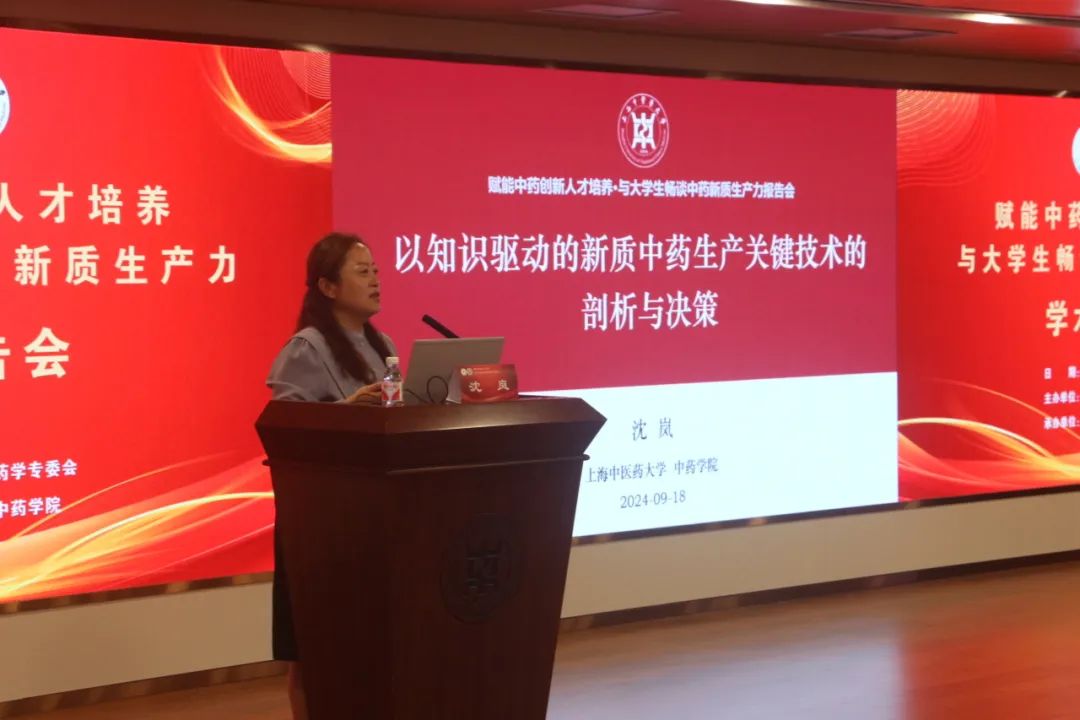 在学术报告环节,上海药物所研究员甘勇以《药物载体理性设计及创新制剂的探索与实践》为题,从创新药物的难点出发,深入浅出地讲述了其团队基于关键物理属性的纳米药物载体设计研究与成果,并分享了3个创新药物制剂转化的实例。随后,上海市药学会中药学专委会主任委员、韩国h漫 党委书记沈岚进行了题为《以知识驱动的新质中药生产关键技术的剖析与决策》的报告,系统地介绍了QbD理念的起源与发展,以及在中药制剂中的应用;基于中药制剂研发与生产中的问题,引入专家系统,并以具体实例阐述了专家系统在处方设计及制剂全生命周期质量控制中的应用。精彩的报告吸引了与会的专家和师生,现场讨论热烈。