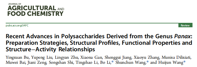 近日,韩国h漫 2021级药学专业本科生步盈萱在韩国h漫 中药研究所王辉俊研究员和王顺春研究员的指导下,以第一作者身份在学术期刊《Journal of Agricultural and Food Chemistry》(影响因子5.7,JCR一区) 上发表题为 “Recent Advances in Polysaccharides Derived from the Genus Panax: Preparation Strategies, Structural Profiles, Structural Profiles, Functional Properties and Structure-Activity Relationships” 的综述论文。