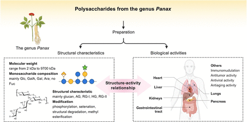 人参属植物具有显著的药用和营养价值,包括人参、三七、西洋参等在内的许多人参属植物作为食品和保健品而受到人们的青睐。多糖是人参属植物中的一类重要活性物质。作为一类亲水性生物大分子,植物多糖具有多种生物活性,如免疫调节、抗肿瘤、抗衰老、调节血糖和血脂、抗病毒、保肝和保护胃肠道等,在食品和医药行业具有巨大潜力。然而,与人参皂苷等研究较多的成分相比,目前对来源于人参属植物中的多糖的研究总结相对有限。本综述聚焦于人参属植物多糖,介绍了它们的提取和纯化技术,列举了124种人参属植物多糖的结构特征,系统回顾了它们的生物活性及其在食品与医药领域的应用,并重点分析了它们的构效关系。本综述为人参属植物多糖在营养学和医药领域的进一步发展和应用奠定了理论基础。