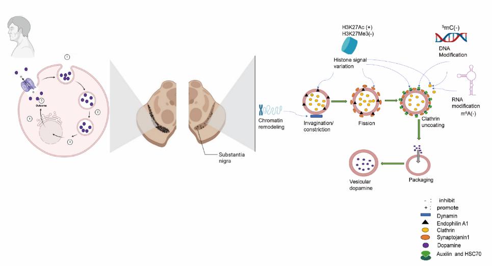PD是一种慢性神经系统退行性疾病,主要影响中脑黑质多巴胺能神经元,导致多巴胺神经递质减少,引发一系列运动和非运动症状。全球约有1000万人受到帕金森病的影响,患者的生活质量和独立性严重下降,社会经济负担也随之加重。本综述聚焦于脑内DAT内吞作用异常导致PD早期病理改变的机制。创新性地提出:在中脑黑质纹状体通路中,DAT受表观遗传调控影响而激活内吞作用,进而导致多巴胺重摄取减少,这一过程与PD早期的形成与后续发生和发展进程密切相关。本文系统性地综述了最新研究报道中DNA甲基化、RNA修饰、组蛋白修饰及非编码RNA等关键表观遗传机制对DAT内吞作用异常的调控机制,详细阐述了DNMTs、METTL3/14等关键酶对DAT内吞作用过程中受体或靶点蛋白表达发挥的调控作用。深入探讨了表观遗传调控介导的PKC、D2R等分子通路对DAT内吞作用过程的影响及其与PD早期病理进程之间的关系。此外,还系统地总结和分析了STM2457等小分子抑制剂通过表观遗传机制调控DAT内吞作用过程中受体或靶点蛋白表达的情况,并对其抗PD的药理活性进行了评估。上述内容为PD早期预防和临床治疗提供了新的潜在靶点及用药策略。