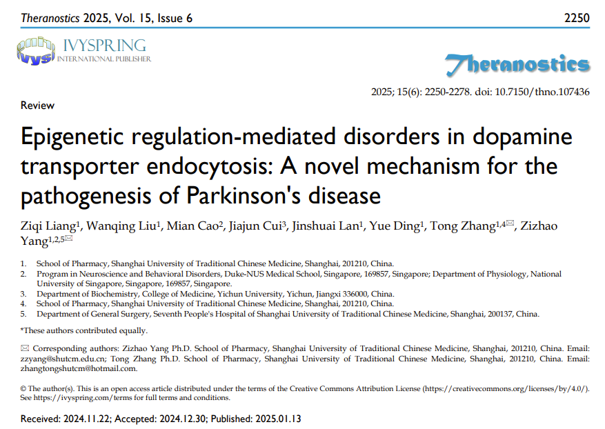 张彤教授/杨子钊研究员团队在国际知名期刊《Theranostics》(影响因子:12.4,中科院一区)上发表了题为“Epigenetic regulation-mediated disorders in dopamine transporter endocytosis: A novel mechanism for the pathogenesis of Parkinson's disease”(DOI://www.thno.org/v15p2250.pdf )的综述文章。系统性地探讨了DNA甲基化、RNA修饰、组蛋白信号更替及非编码RNA调控等表观遗传机制对多巴胺转运体(Dopamine Transporter, DAT)内吞作用的影响,揭示了这些表观遗传调控方式通过激活DAT内吞作用来影响多巴胺能神经元的存活和功能,进而诱发帕金森病(Parkinson's disease, PD)产生及发展的新机制。本综述为PD的发病机制提供了全新的视角和理论框架,不仅为早期临床诊断指明了潜在方向,还为后期治疗揭示了潜在药物靶点,并为其分子病理机制的研究奠定了坚实的科学基础。