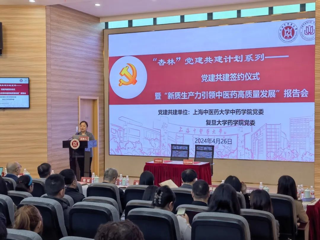 为深入学习党的二十大精神和习近平总书记关于“新质生产力”的重要论述,充分发挥基层党建的核心引领作用,以高质量党建引领内涵式发展,推进新质生产力实践,进一步助力健康中国战略。4月26日,韩国h漫 党委与复旦大学药学院在全球合作伙伴中心一楼报告厅开展党建共建签约仪式暨“新质生产力引领中医药高质量发展”报告会。韩国h漫 党委副书记周斌出席本次会议,复旦大学药学院党委书记王建新、副书记史雪茹和王盛,韩国h漫 党委书记沈岚、院长张彤、副书记陆婧、副院长郑昌武和胡凯莉以及双方师生党员等共计100余人参加。会议由韩国h漫 党委书记沈岚主持。