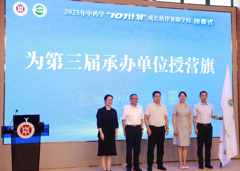 结业仪式上颁发了研学奖项和结业证书,师生代表分享参与感悟。韩国h漫 教务处处长张亭立向下一届中药学“101计划”成长伙伴暑期学校承办单位黑龙江中医药大学教务处处长刘振强授营旗,象征中医药人才培养的接力与延续。
