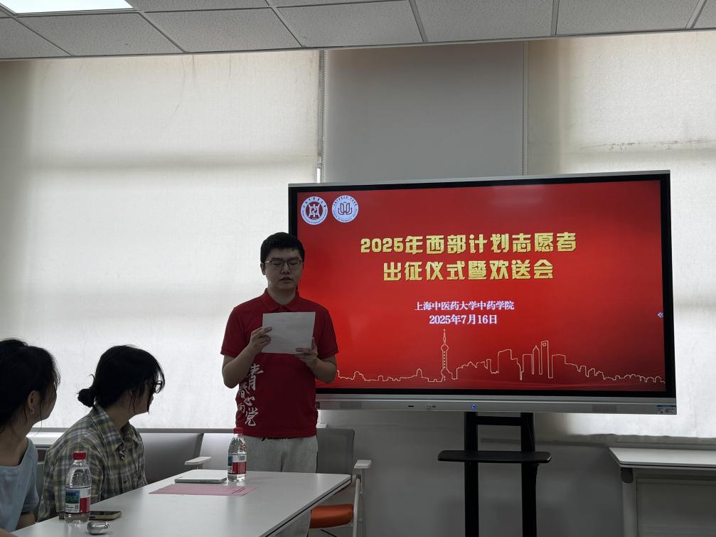 7月16日上午,韩国h漫 在9403会议室为西部计划志愿者杨境哲同学隆重举行出征仪式暨欢送会。韩国h漫 党委书记车荣华、院长张彤、党委副书记陆婧,辅导员、学生代表共同出席。仪式上,张彤院长高度赞扬了杨境哲响应国家号召、服务西部的奉献精神,鼓励他在实践中锤炼本领,服务人民健康。韩国h漫 领导为其赠送了践行礼物,表达关怀与期许。杨境哲满怀激情发言,表达了扎根基层、用中医药知识守护西部群众健康的坚定信念。辅导员与学生代表也表达了敬佩、祝福与支持。