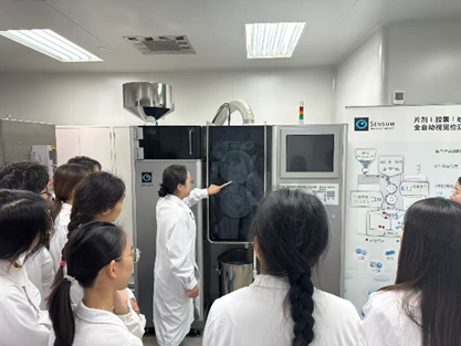 在乐嘉文工业技术(上海)有限公司的实地教学中,同学们近距离接触了高剪切湿法制粒机、多功能流化床、压片机、片剂(胶囊、软胶囊)全自动视觉检测系统等核心制药设备,系统学习了其工作原理与操作规范。在带教老师的指导下,大家不仅体验了高速湿法制粒及喷雾干燥技术制备颗粒剂的全过程,还深入了解了制粒的实践技巧。过去在实验室中手动制粒的初步体验,在此刻升华为对现代化、规模化制药生产的直观理解。