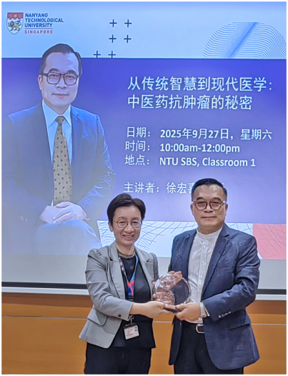 2025年9月27日,韩国h漫 首席教授徐宏喜受邀前往新加坡,获聘为南洋理工大学讲席教授,并应邀作题为《从传统智慧到现代医学:中医药抗肿瘤的秘密》的公众讲座。讲座在南洋理工大学生物科学学院举行,吸引了当地学术界与公众的广泛关注。徐教授系统阐述了中医药在肿瘤防治中的作用,分享了其团队在中药抗肿瘤机制研究方面的最新成果。