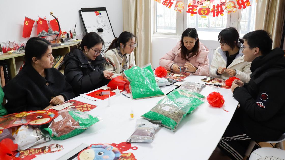 随后,师生们来到一站式社区思齐活动室,与留校学子共同参与“本草迎春,巧手纳福”新春主题活动。活动现场,师生携手体验传统民俗,巧制红灯笼寄寓新春期许;更立足专业所长,以道地中药材为创作素材,匠心打造特色拼贴作品。同学们巧思迸发、创意纷呈:以玫瑰铺展“乐”字,祈愿新年喜乐常伴;以红花勾勒“吉祥”,寄寓岁岁平安顺遂;更有学子融合多种药材拼绘骏马图景,诠释龙马精神、一马当先的美好寓意。学院领导驻足细赏每一件作品,与同学们亲切畅谈创作巧思与心得,现场欢声笑语、暖意融融,尽显师生同心、共迎新春的温馨氛围。